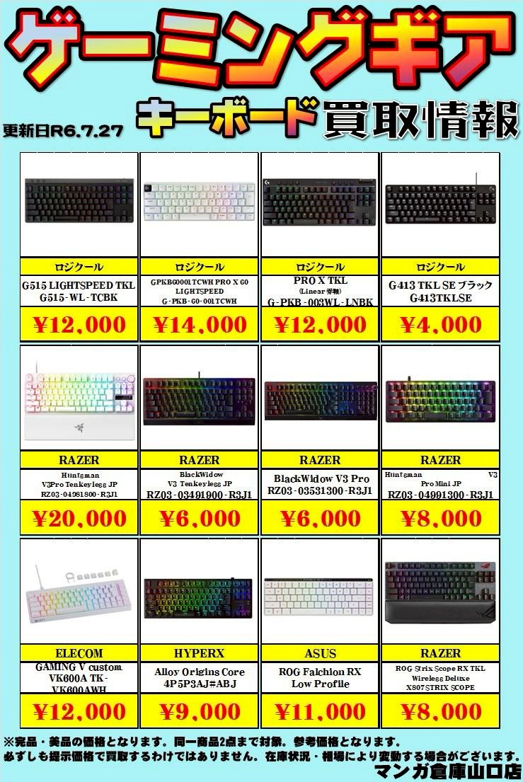 2025.07.14 買取情報 takalab_5 ★家電コーナーより《VSPO!GEARゲーミングキーボード 花芽すみれEDITION 》入荷しました! X.com Facebook はてブ LINE Pocket ★家電コーナーより★ VSPO!GEARゲーミングキーボード 花芽すみれEDITION 入荷しました! マンガ倉庫山口店ではゲーミングデバイスを買取強化中です! 購入したけど使わなかった、プレイスタイルに合わなかった、そんなデバイスがありましたら是非当店にお売り下さい! ※2025/7/14 現在の価格となります。 在庫状況などによってお値段が変動いたします。予めご了承ください。 シェア! X.com Facebook はてブ LINE Pocket feedly コメントを残す コメントをキャンセルメールアドレスが公開されることはありません。 ※ が付いている欄は必須項目ですコメント ※ 名前 ※ メール ※ サイト 新しいコメントをメールで通知 新しい投稿をメールで受け取る Δ このサイトはスパムを低減するために Akismet を使っています。コメントデータの処理方法の詳細はこちらをご覧ください。