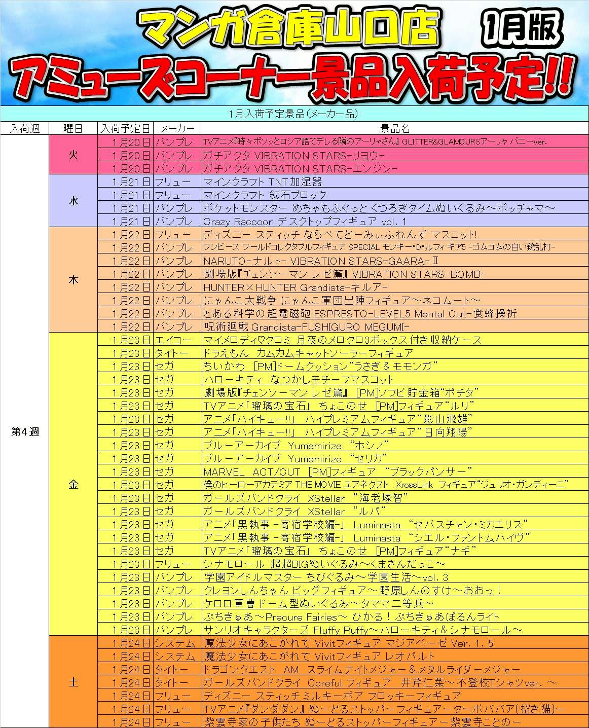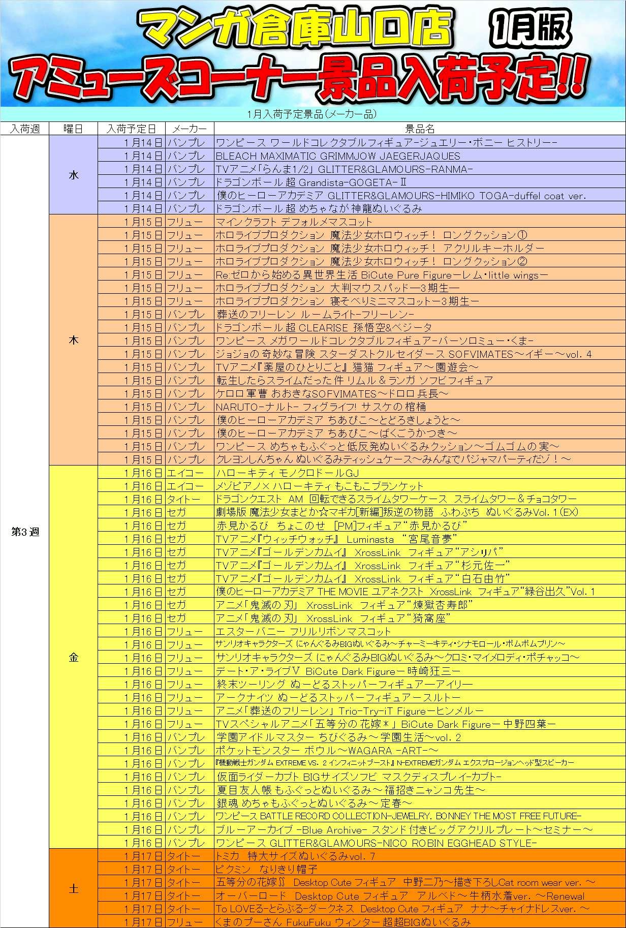 2025.12.29 アミューズ takalab_2 ★1月 入荷予定景品★ X.com Facebook はてブ LINE Pocket 1Fアミューズメントコーナーより 1月の入荷予定景品です! シェア! X.com Facebook はてブ LINE Pocket feedly コメントを残す コメントをキャンセルメールアドレスが公開されることはありません。 ※ が付いている欄は必須項目ですコメント ※ 名前 ※ メール ※ サイト 新しいコメントをメールで通知 新しい投稿をメールで受け取る Δ このサイトはスパムを低減するために Akismet を使っています。コメントデータの処理方法の詳細はこちらをご覧ください。