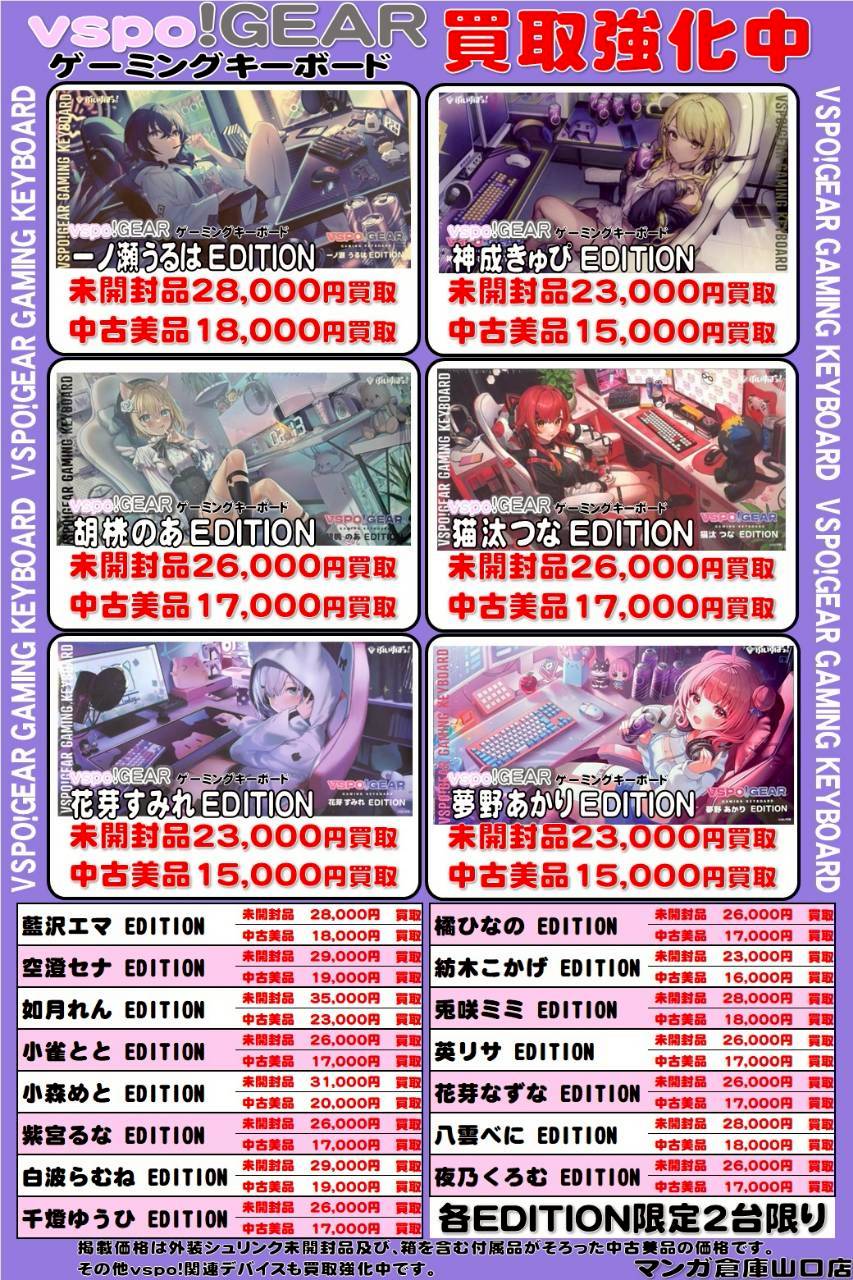 2026.01.13 買取情報 takalab_5 💻PCコーナー買取情報⌨️《VSPO!GEAR ゲーミングキーボード&マウスパッド 橘ひなのEDITION》買取ました! X.com Facebook はてブ LINE Pocket 💻PCコーナー買取情報⌨️ ・VSPO!GEAR ゲーミングキーボード&マウスパッド 橘ひなのEDITION 買取させて頂きました🎶 マンガ倉庫山口店では、VSPO!GEARの買取を強化中です! 箱無しでも買取大歓迎です✌️ その他メーカーのゲーミングギアもどんどん買います! 是非マンガ倉庫山口店へお持ちください😉 シェア! X.com Facebook はてブ LINE Pocket feedly コメントを残す コメントをキャンセルメールアドレスが公開されることはありません。 ※ が付いている欄は必須項目ですコメント ※ 名前 ※ メール ※ サイト 新しいコメントをメールで通知 新しい投稿をメールで受け取る Δ このサイトはスパムを低減するために Akismet を使っています。コメントデータの処理方法の詳細はこちらをご覧ください。