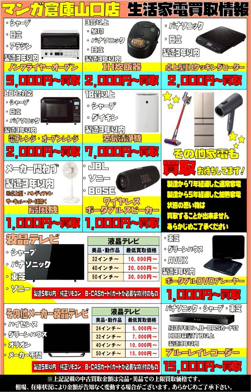 マンガ倉庫山口店では各種家電品の買取も強化中です!