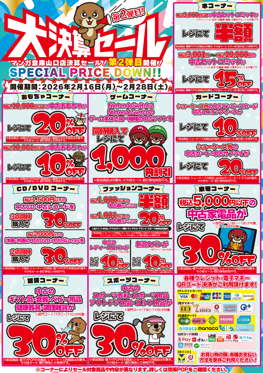2026.02.16 イベント情報 takalab_5 ★✨《2月16日~28日》大決算セール第2弾 開催✨★ X.com Facebook はてブ LINE Pocket ★✨大決算セール第2弾 開催✨★ 📢マンガ倉庫山口店では、本日2月16日(月)から大決算セール第2弾目を開催❗️ 開催期間は2月16日(月)~2月28日(土)の13日間❗️ 1弾目に引き続き、本、CD、カード、ゲーム、おもちゃ、ファッション衣料、スポーツ用品、家電、雑貨品など、多数お安くなっております😳❗️お見逃しなく❗️❗️ ********************************** その他買取情報はこちら! その他イベント情報はこちら! シェア! X.com Facebook はてブ LINE Pocket feedly コメントを残す コメントをキャンセルメールアドレスが公開されることはありません。 ※ が付いている欄は必須項目ですコメント ※ 名前 ※ メール ※ サイト 新しいコメントをメールで通知 新しい投稿をメールで受け取る Δ このサイトはスパムを低減するために Akismet を使っています。コメントデータの処理方法の詳細はこちらをご覧ください。