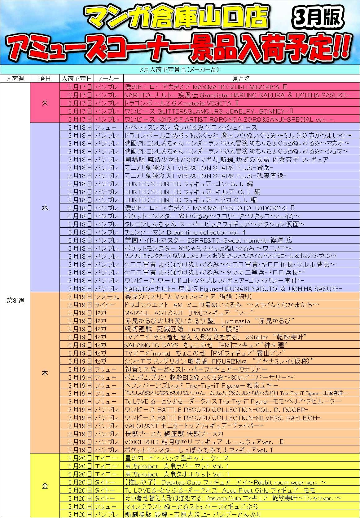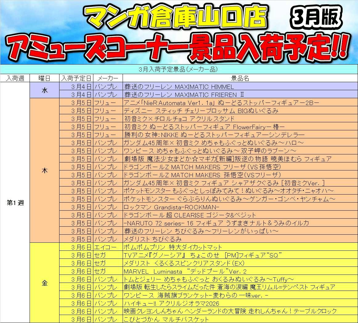 2026.03.02 アミューズ takalab_6 ★アミューズ 3月景品入荷情報★ X.com Facebook はてブ LINE Pocket 1Fアミューズメントコーナーより 3月の入荷予定景品🌸 シェア! X.com Facebook はてブ LINE Pocket feedly コメントを残す コメントをキャンセルメールアドレスが公開されることはありません。 ※ が付いている欄は必須項目ですコメント ※ 名前 ※ メール ※ サイト 新しいコメントをメールで通知 新しい投稿をメールで受け取る Δ このサイトはスパムを低減するために Akismet を使っています。コメントデータの処理方法の詳細はこちらをご覧ください。