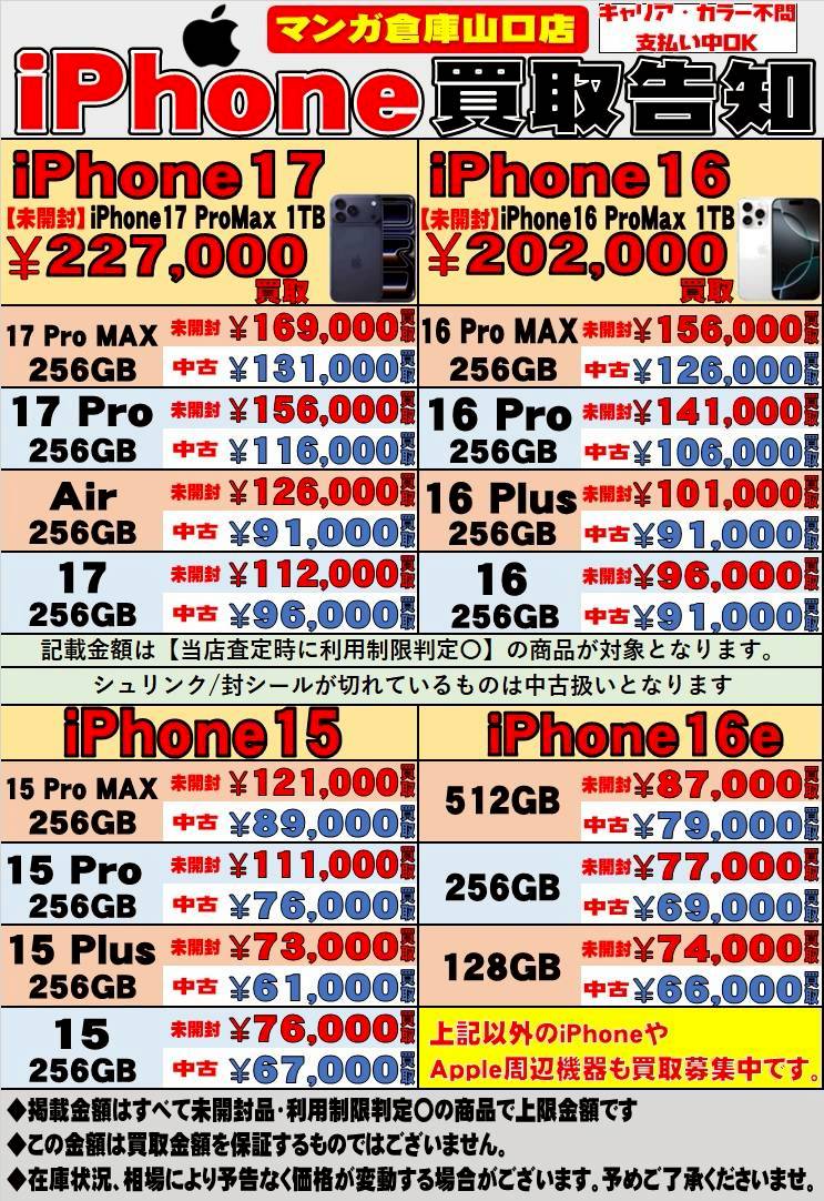 2026.03.04 買取情報 takalab_6 Apple製品買取ます! X.com Facebook はてブ LINE Pocket 家電コーナーより、 Apple製品買取ます! マンガ倉庫山口店では各種Apple製品を買取強化中です! iPhone、iPad、AirPods等のApple製品は是非当店にお売り下さい! 2026/3/4 現在の価格となっております。 相場の変動や在庫状況により告知なく価格が変更となる場合がございますのでご了承ください。 ********************************** その他買取情報はこちら! その他イベント情報はこちら! シェア! X.com Facebook はてブ LINE Pocket feedly コメントを残す コメントをキャンセルメールアドレスが公開されることはありません。 ※ が付いている欄は必須項目ですコメント ※ 名前 ※ メール ※ サイト 新しいコメントをメールで通知 新しい投稿をメールで受け取る Δ このサイトはスパムを低減するために Akismet を使っています。コメントデータの処理方法の詳細はこちらをご覧ください。