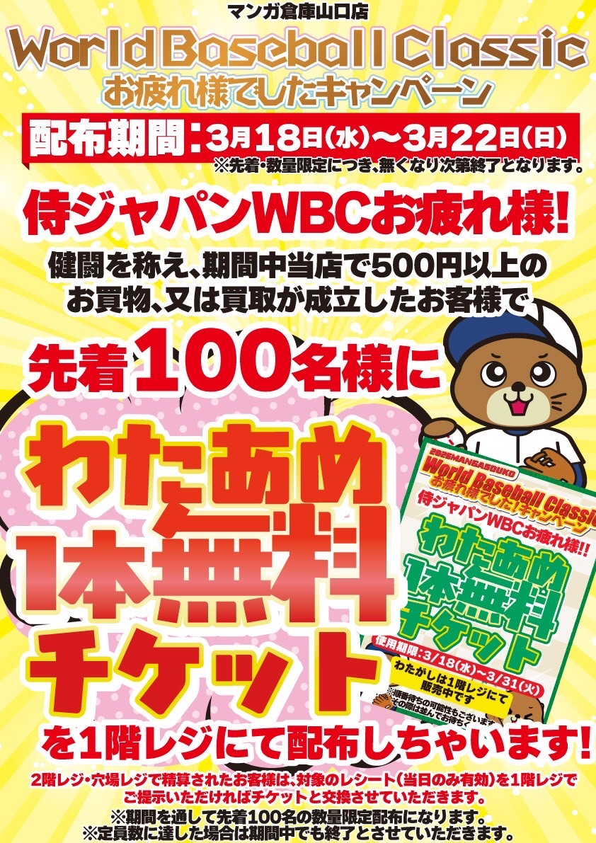 2026.03.18 イベント情報 takalab_2 ★《3月18日~22日》期間中当店で500円以上お買い上げもしくは買取成立で 先着100名様にわたあめ無料チケットを配布中‼️★ X.com Facebook はてブ LINE Pocket ✨本日より✨ 侍ジャパンWBCお疲れ様でした‼️ 健闘を称えマンガ倉庫山口店では 期間中当店で500円以上お買い上げもしくは買取成立で 先着100名様にわたあめ無料チケットを配布中‼️ 是非皆様のご来店お待ちしてます🙌 ********************************** その他買取情報はこちら! その他イベント情報はこちら! シェア! X.com Facebook はてブ LINE Pocket feedly コメントを残す コメントをキャンセルメールアドレスが公開されることはありません。 ※ が付いている欄は必須項目ですコメント ※ 名前 ※ メール ※ サイト 新しいコメントをメールで通知 新しい投稿をメールで受け取る Δ このサイトはスパムを低減するために Akismet を使っています。コメントデータの処理方法の詳細はこちらをご覧ください。