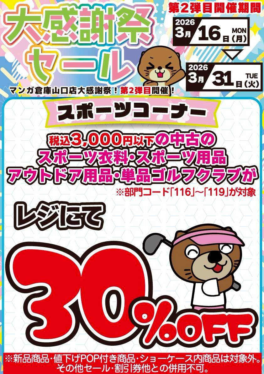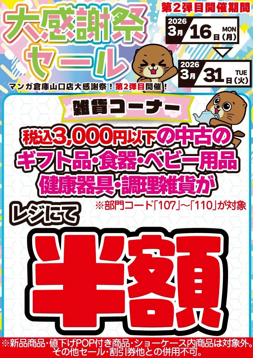 2026.03.21 イベント情報 takalab_5 ■《3月31日まで》リサイクルコーナーより、 只今マンガ倉庫山口店 大感謝祭セール開催中です!■ X.com Facebook はてブ LINE Pocket リサイクルコーナーより、 只今マンガ倉庫山口店 大感謝祭セール開催中です! 税抜5000円以下の中古家電品がレジにて30%OFF! 税抜3000以下のスポーツ用品もレジにて30%OFF! 税抜3000円以下の中古ギフト、食器、健康器具、雑貨 はレジにてなんと半額になります! 大変お得なセールですので是非この機会にマンガ倉庫山口店のリサイクルコーナーに足をお運び下さい! ご来店お待ちしております! その他買取情報はこちら! その他イベント情報はこちら! シェア! X.com Facebook はてブ LINE Pocket feedly コメントを残す コメントをキャンセルメールアドレスが公開されることはありません。 ※ が付いている欄は必須項目ですコメント ※ 名前 ※ メール ※ サイト 新しいコメントをメールで通知 新しい投稿をメールで受け取る Δ このサイトはスパムを低減するために Akismet を使っています。コメントデータの処理方法の詳細はこちらをご覧ください。