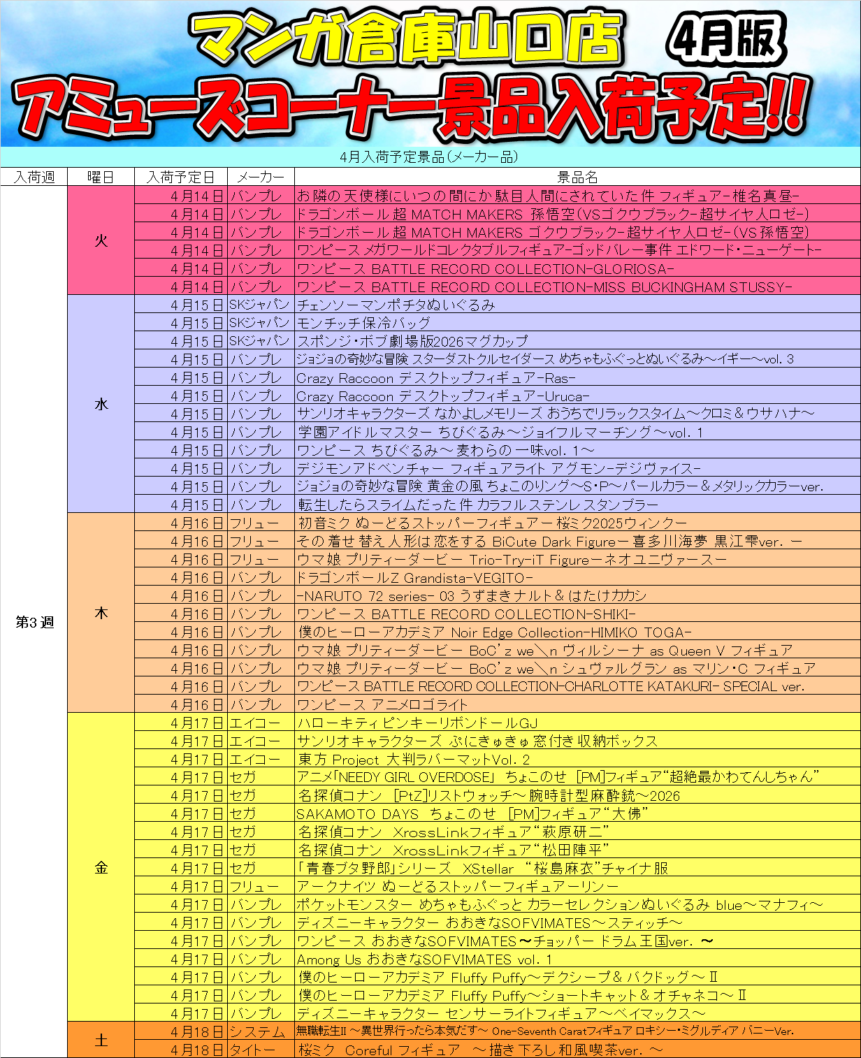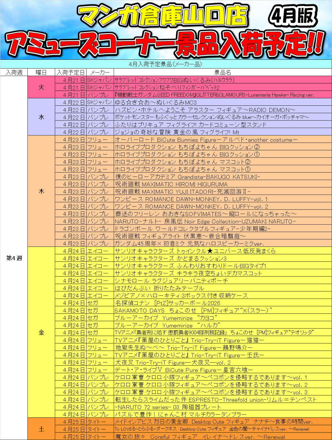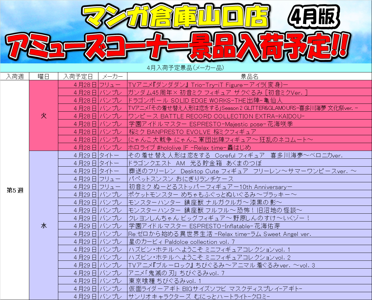 2026.04.01 アミューズ takalab_2 ■1Fアミューズメントコーナーより4月の入荷予定景品です!■ X.com Facebook はてブ LINE Pocket 1Fアミューズメントコーナーより4月の入荷予定景品です! シェア! X.com Facebook はてブ LINE Pocket feedly コメントを残す コメントをキャンセルメールアドレスが公開されることはありません。 ※ が付いている欄は必須項目ですコメント ※ 名前 ※ メール ※ サイト 新しいコメントをメールで通知 新しい投稿をメールで受け取る Δ このサイトはスパムを低減するために Akismet を使っています。コメントデータの処理方法の詳細はこちらをご覧ください。