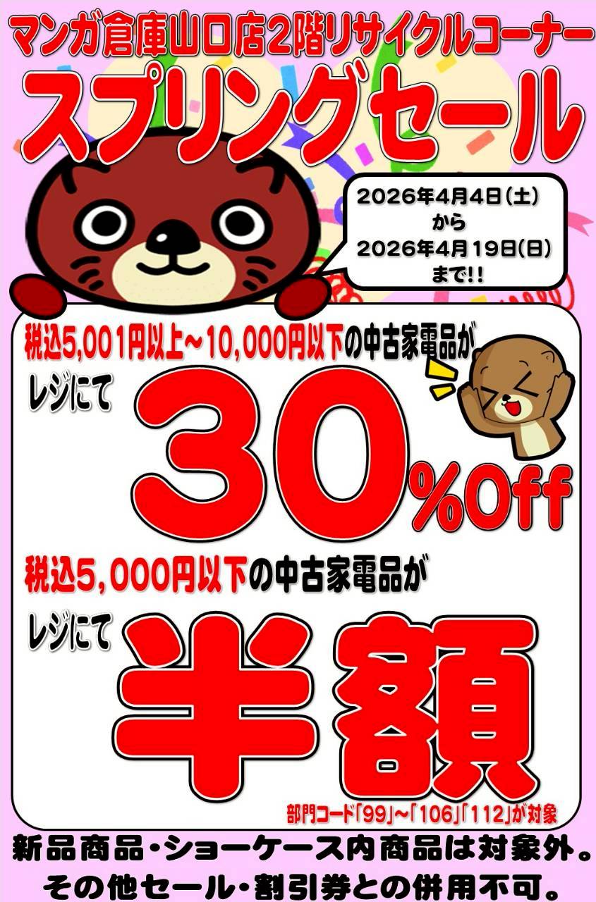 2026.04.08 お知らせ takalab_2 ■リサイクルコーナー改装リニューアル! スプリングセールも開催中!■ X.com Facebook はてブ LINE Pocket ★2階リサイクルコーナーより★ マンガ倉庫山口店2階リサイクルコーナー、改装リニューアル致しました! さらにスプリングセールも開催中です! 新生活に必要な家電品や雑貨をお得に買える大チャンス! 是非この機会にマンガ倉庫山口店にご来店下さい! ※2026/4/8 現在の価格となります。 在庫状況などによってお値段が変動いたします。予めご了承ください。 シェア! X.com Facebook はてブ LINE Pocket feedly コメントを残す コメントをキャンセルメールアドレスが公開されることはありません。 ※ が付いている欄は必須項目ですコメント ※ 名前 ※ メール ※ サイト 新しいコメントをメールで通知 新しい投稿をメールで受け取る Δ このサイトはスパムを低減するために Akismet を使っています。コメントデータの処理方法の詳細はこちらをご覧ください。