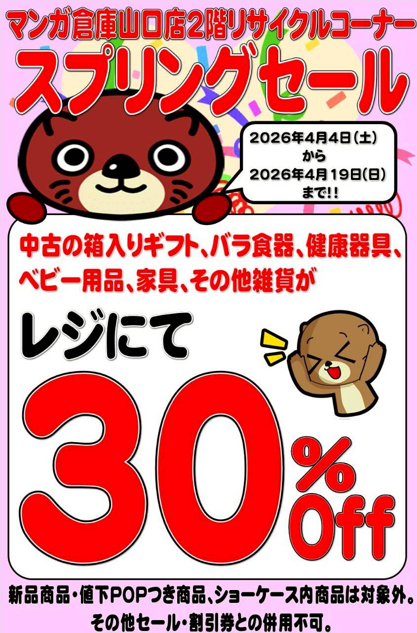 2026.04.14 イベント情報 takalab_2 ★マンガ倉庫山口店2階リサイクルコーナーでは只今スプリングセールを開催中です!★ X.com Facebook はてブ LINE Pocket マンガ倉庫山口店2階リサイクルコーナーでは只今スプリングセールを開催中です! 新生活に必要な家電品や雑貨をお得に買える大チャンス! 4月19日の日曜日までのセールです、この機会にマンガ倉庫山口店にご来店下さい! 2026/4/14 現在の価格となっております。 相場の変動や在庫状況により告知なく価格が変更となる場合がございますのでご了承ください。 ********************************** その他買取情報はこちら! その他イベント情報はこちら! シェア! X.com Facebook はてブ LINE Pocket feedly コメントを残す コメントをキャンセルメールアドレスが公開されることはありません。 ※ が付いている欄は必須項目ですコメント ※ 名前 ※ メール ※ サイト 新しいコメントをメールで通知 新しい投稿をメールで受け取る Δ このサイトはスパムを低減するために Akismet を使っています。コメントデータの処理方法の詳細はこちらをご覧ください。
