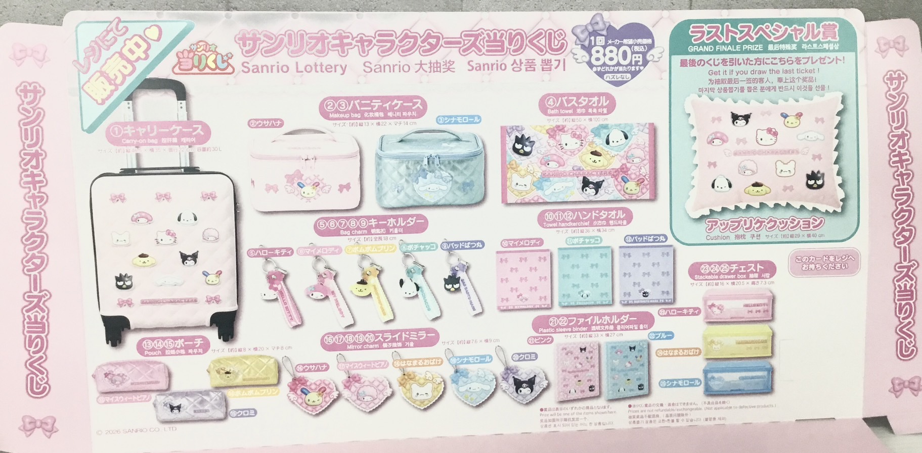 2026.04.17 おもちゃ&ホビー takalab_5 ✨4/18土曜日朝10時より販売開始✨ サンリオキャラクターズ当りくじ✨ X.com Facebook はてブ LINE Pocket おもちゃコーナーより 4/18土曜日朝10時より販売開始✨ サンリオキャラクターズ当りくじ 1回880円 回数制限なし 「ハローキティ」「マイメロディ」「ポムポムプリン」「ポチャッコ」「バッドばつ丸」「ウサハナ」「マイスウィートピアノ」「はなまるおばけ」「シナモロール」「クロミ」たちに注目した新作当たりくじ‼️ ぷっくりデザインをテーマに、ハートやリボンモチーフの可愛らしいアイテムがいっぱい♥️ 是非ペリペリしに来てください🎉 シェア! X.com Facebook はてブ LINE Pocket feedly コメントを残す コメントをキャンセルメールアドレスが公開されることはありません。 ※ が付いている欄は必須項目ですコメント ※ 名前 ※ メール ※ サイト 新しいコメントをメールで通知 新しい投稿をメールで受け取る Δ このサイトはスパムを低減するために Akismet を使っています。コメントデータの処理方法の詳細はこちらをご覧ください。