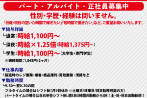 販売、買取・買取フォロー、売り場づくり、商品品出しなど
