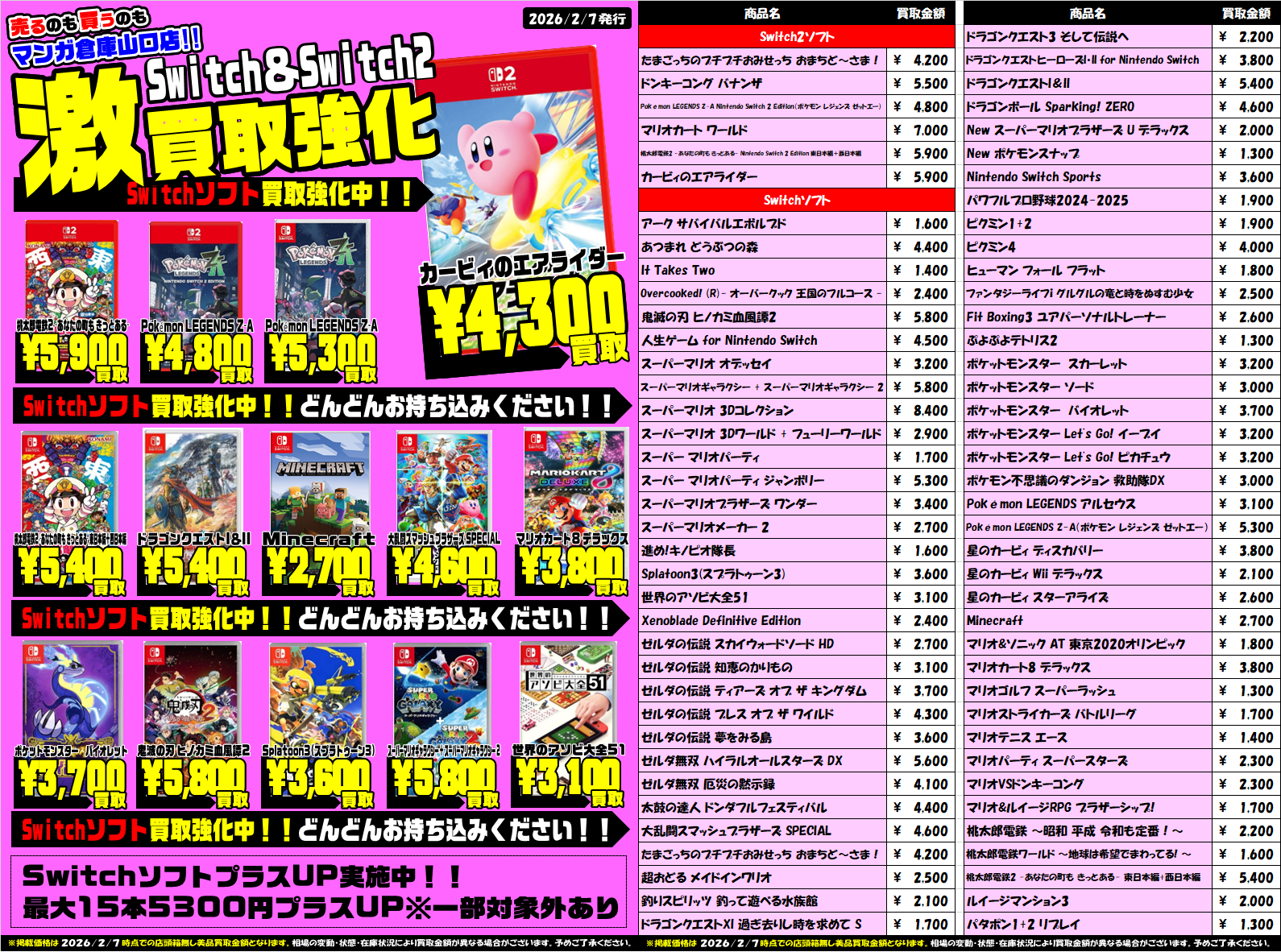2020.02.24 告知 manager ■ゲームソフト買取告知■ X.com Facebook はてブ LINE Pocket ※2026年2月7日更新 ※美品・完品の金額となります。状態により金額が変動する場合がございます。また在庫状況により金額が変動する場合がございますのであらかじめご了承ください。 シェア! X.com Facebook はてブ LINE Pocket feedly コメントを残す コメントをキャンセルメールアドレスが公開されることはありません。 ※ が付いている欄は必須項目ですコメント ※ 名前 ※ メール ※ サイト Δ このサイトはスパムを低減するために Akismet を使っています。コメントデータの処理方法の詳細はこちらをご覧ください。